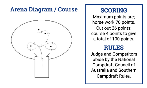 The aim of the competition is to cut a beast from a small mob in the camp, moving their horse among the cattle quietly and bring the chosen beast to a gate at the other end (front) of the (camp) yard, for a short time blocking the beast two or three times preventing it from returning to the mob.