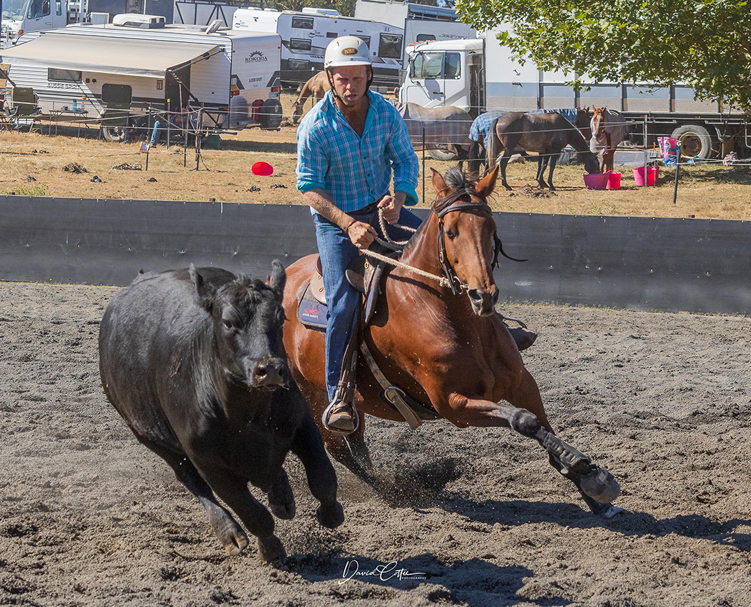 Once on the arena, the competitor is working against the clock (forty seconds) to guide the beast around two pegs in a figure of eight pattern, and then drive the beast between a final two pegs known as the gate. The best combination of control of the beast, riding skills, speed and completing the course scores the highest points. It is not unusual to see a beast gated in under twenty-five seconds, demonstrating the speed and agility of the specially trained horses.